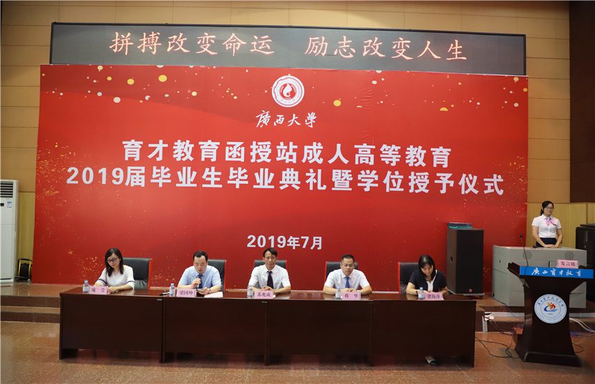 7月21日上午,廣西大學育才教育函授站成人高等教育2019屆畢業(yè)生畢業(yè)典禮暨學位授予儀式在柳州本部隆重舉行。廣西大學繼續(xù)教育學院院長蘇兆成、招生與學生管理科科長梁海萍、辦公室副主任龐瑩、集團聯(lián)合黨委書記、董事長、函授站站長蔣華以及100余名畢業(yè)生代表參加了畢業(yè)典禮,典禮由集團總校校長梁國坤主持。