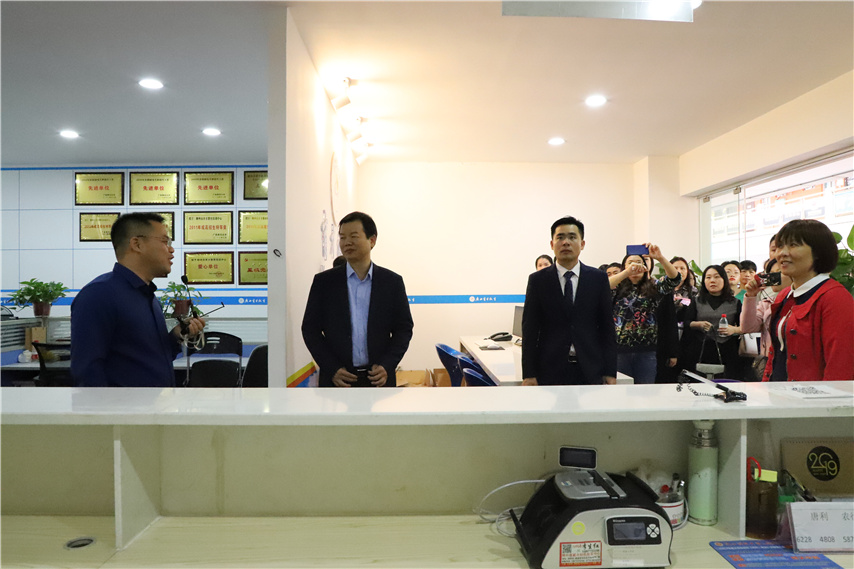 ▲覃志和院長(zhǎng)(中)和唐曉華副院長(zhǎng)(左一)了解黨建孵化中心架構(gòu)