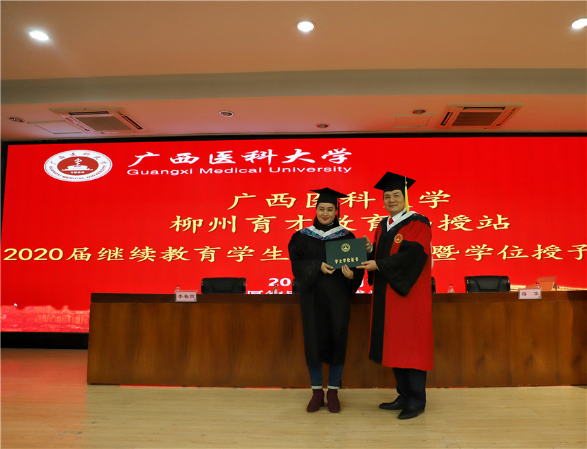 1月11日下午,廣西醫(yī)科大學(xué)柳州育才教育函授站2020屆成高畢業(yè)典禮暨學(xué)位授予儀式在柳州市人民醫(yī)院第一學(xué)術(shù)報告廳隆重舉行。廣西醫(yī)科大學(xué)繼續(xù)教育學(xué)院院長、廣西醫(yī)科大學(xué)學(xué)位評定委員會委員、主任醫(yī)師趙邦教授、副院長劉慶委、李春燕,院辦主任黃明、教務(wù)科科長馮政毅、招生工作與學(xué)生管理科科長韋先良,集團(tuán)聯(lián)合黨委書記、董事長、函授站站長蔣華以及來自柳州醫(yī)藥系統(tǒng)畢業(yè)生代表參加了畢業(yè)典禮,典禮由集團(tuán)聯(lián)合黨委副書記、副站長王志主持。