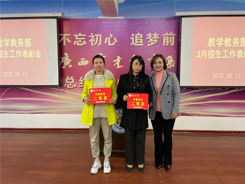 4月13日上午,集團(tuán)教學(xué)教務(wù)部3月招生工作表彰會(huì)在柳州本部水晶印象召開,集團(tuán)聯(lián)合黨委紀(jì)檢委員、副校長(zhǎng)李彩梅,教學(xué)教務(wù)部部長(zhǎng)韋彥清,教學(xué)教務(wù)部副部長(zhǎng)韋秋燕等教學(xué)教務(wù)部職工參加了會(huì)議。會(huì)上,對(duì)在3月份招生工作中表現(xiàn)優(yōu)秀的職工進(jìn)行了表彰,優(yōu)秀職工代表在會(huì)上給大家分享了招生心得體會(huì)。