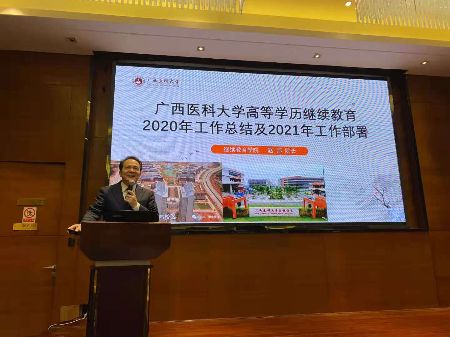 趙邦院長總結(jié)回顧了廣西醫(yī)科大學(xué)高等學(xué)歷繼續(xù)教育2019年招生工作及2020年教學(xué)工作情況,部署了2020年招生工作及2021年教學(xué)工作。提出四點(diǎn)要求:一要堅(jiān)持規(guī)模發(fā)展,拓展招生市場渠道;二要加大工作力度,依規(guī)開展招生;三要堅(jiān)持立德樹人,深化教育教學(xué)改革;四要堅(jiān)持有效解決工學(xué)這個矛盾不停步。