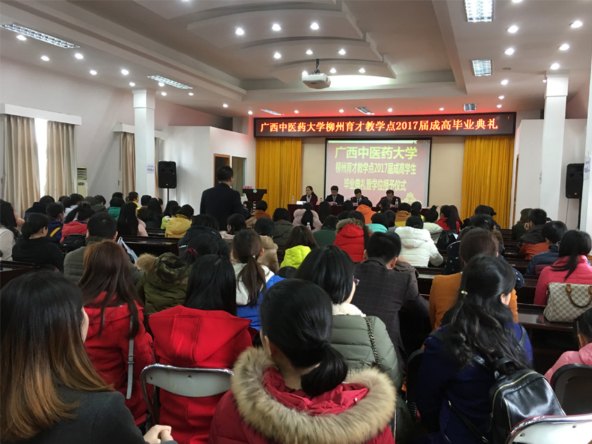 1月15日下午,廣西中醫(yī)藥大學(xué)育才教學(xué)點(diǎn)2017屆成高學(xué)生畢業(yè)典禮暨學(xué)位授予儀式在柳州市中醫(yī)院勝利召開。廣西中醫(yī)藥大學(xué)成教院院長(zhǎng)、博士生導(dǎo)師、二級(jí)教授韋艾凌、副院長(zhǎng)黃瑞誠(chéng)、院長(zhǎng)助理、培訓(xùn)部主任楊繼峰出席了畢業(yè)典禮,韋艾凌院長(zhǎng)發(fā)表重要講話。廣西中醫(yī)藥大學(xué)育才教學(xué)點(diǎn)負(fù)責(zé)人蔣華老師,育才教育李彩梅副校長(zhǎng)以及來自柳州各大醫(yī)院、衛(wèi)生院、醫(yī)藥公司和藥店近100多名畢業(yè)生代表共同參加了畢業(yè)典禮。